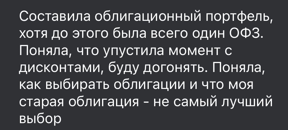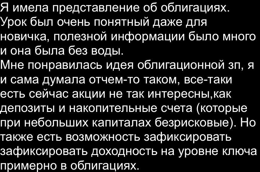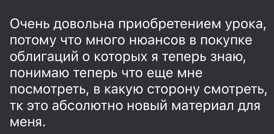 Ранее использовала только банковские вклады, инвестиции в едвижимость и землю. Благодаря обучению видит новые возможности для себя.