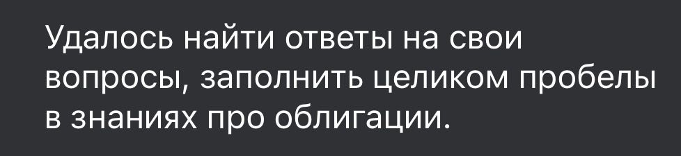 Рада, что первое обучение по крипте именно это, так как оно экспертно, убирает страх риска. По итогам обучения открыла счет на бирже, завела деньги, покупает токены, заработала первые деньги на крипте. Ежедневные инсайты из чата, сформировала свою стратегию на крипторынке.